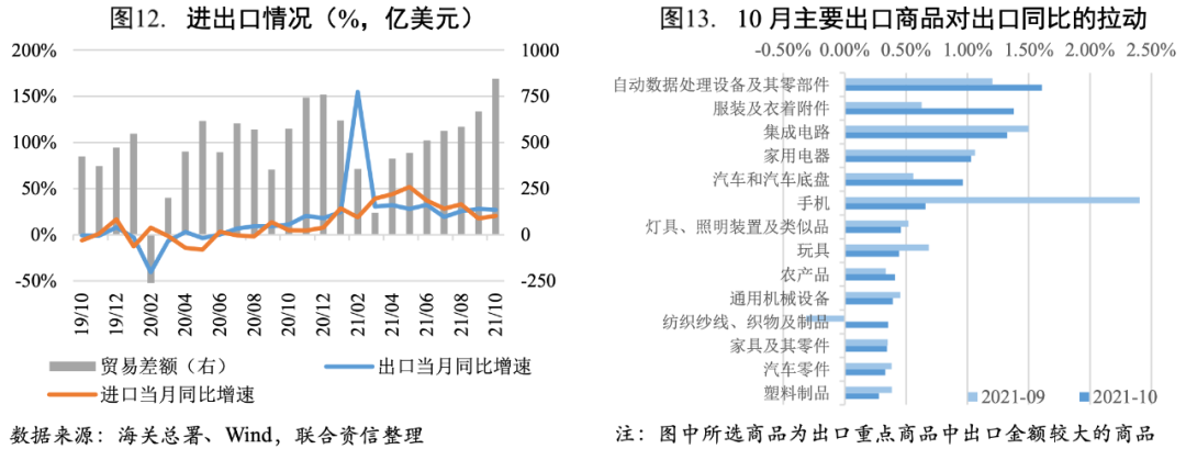 2021年10月我國貨物進出口總額5159.03億美元,同比增長24.30%,增速仍然較高;但環比(-5.30%)有所下降。其中,出口3002.21億美元,同比增長27.10%,仍然維持較高增速,環比小幅下降1.80%,依然表現出較強的韌性,一方面是由于歐美作為主要需求國,產需缺口依然較大,另一方面出口替代效應導致我國出口增加。進口2156.80億美元,同比增長20.60%,主要是價格上漲和去年基數(較低)因素導致;環比下降9.70%,符合往年下行規律。整體看,內需對進口的支撐作用較弱。貿易順差845.40億美元,創歷史最高值。2021年前10個月貿易順差累計5106.35億美元,已接近去年全年水平,今年順差規模或將創歷史最高,對經濟的拉動作用或將有所提升。