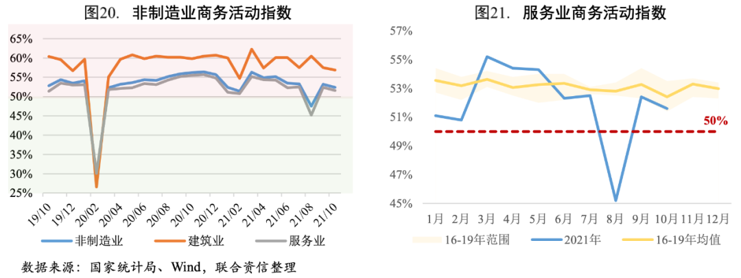 2021年10月,非制造業商務活動指數較上月回落0.80個百分點至52.40%,非制造業繼續保持擴張,但擴張幅度減小。其中服務業景氣度小幅回落,商務活動指數下降0.80個百分點至51.60%,主要是多點散發式疫情給尚處于恢復過程中的服務業帶來較大沖擊。從行業情況來看,受國慶節拉動,與假期消費密切相關的住宿、餐飲、生態保護及環境治理、娛樂等行業商務活動指數均位于55%以上較高景氣區間。但受疫情和天氣等影響,消費者更傾向于就地過節或短途周邊游,10月鐵路運輸、航空運輸等行業商務活動指數雖位于榮枯線以上,但擴張力度相對較弱,景氣水平不及近年同期。建筑業景氣度同步小幅回落,商務活動指數下降0.60個百分點至56.90%,但仍位于較高景氣區間,建筑業生產持續增長。