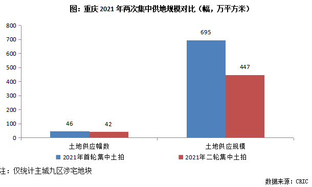 從土地供應(yīng)規(guī)模上來看,重慶(僅考慮主城九區(qū))二輪集中土拍供應(yīng)宅地較首輪明顯減少,涉及42宗宅地,總供應(yīng)建面僅447萬平方米,較首輪總供應(yīng)規(guī)模減少了36%;分區(qū)域來看,北碚區(qū)、沙坪壩區(qū)和九龍坡區(qū)等環(huán)線外區(qū)域土地供應(yīng)比較集中,分別有9、8、8宗,南岸區(qū)、渝北區(qū)、巴南區(qū)、江北等區(qū)域供地相對較少,均不足5宗。