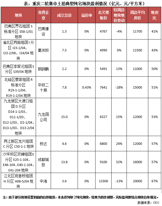 而就盈利情況來看,平均地房比為0.52(不考慮含自持租賃的地塊,下同),較首輪明顯提升,尤其是巴南、渝北的一些地塊,地房比低至0.4,典型如巴南區(qū)界石組團(tuán)S標(biāo)準(zhǔn)分區(qū)S58-1/01地塊,樓面價(jià)僅有4767元/平方米,這一價(jià)格較萬科在周邊拿下的同類地塊樓板價(jià)要低4%(該地在首輪集中出讓,樓板價(jià)4975元/平方米),按照周邊在售項(xiàng)目平均銷售價(jià)11700元/平方米來測算,地房比低至0.41,房地差近7000元/平方米,盈利空間十分可觀。即使是本場土拍中唯一溢價(jià)成交的北碚區(qū)蔡家地塊(樓板價(jià)7641元/平方米),按照周邊在售均價(jià)15000元/平方米來測算的話,地房比也僅有51%,也能保持良好的盈利。