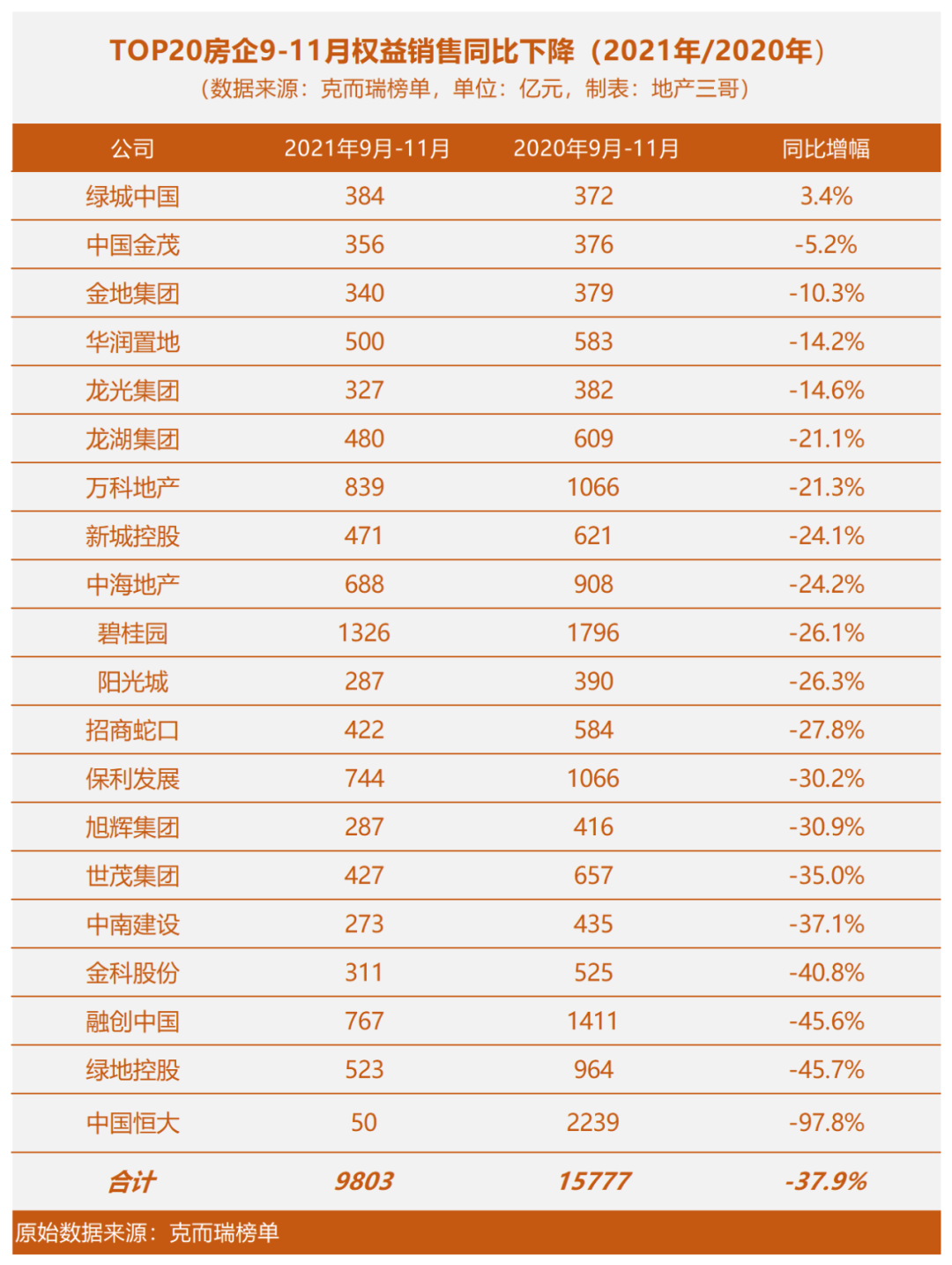 進入9月份后,政策底部疊加市場預期探底,9-11月份房地產整體銷售情況很不樂觀,根據克而瑞的統計,TOP20房企9-11月銷售同比2020年下降37.9%,同時,房企間的分化也比較明顯。