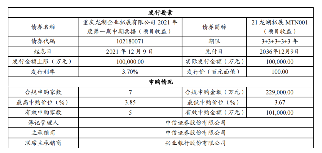 (龍湖集團中期票據發行申購情況:上海清算所)