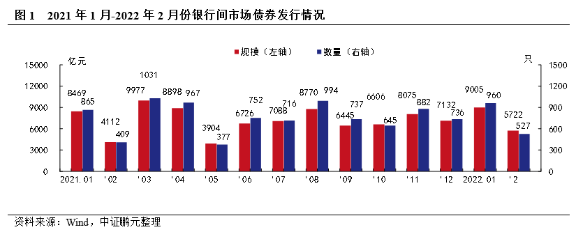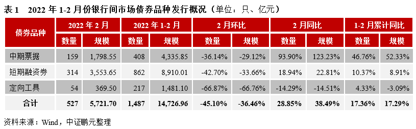2022年2月,我國銀行間市場共發行信用債券527只,發行規模5,721.70億元,環比分別下降45.10%和36.46%,同比分別上升28.85%和38.49%。綜合1-2月來看,信用債券發行1,487只,發行規模為14,726.96億元,同比上升17.36%和17.29%。