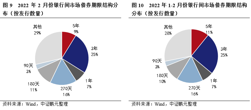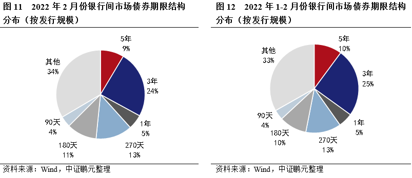 期限方面,2月銀行間市場債券期限集中度同比漲跌互現,3年期和5年期中期票據和定向工具的發行規模占比較上月下降,270天期短期融資券的發行規模占比較上月持平。