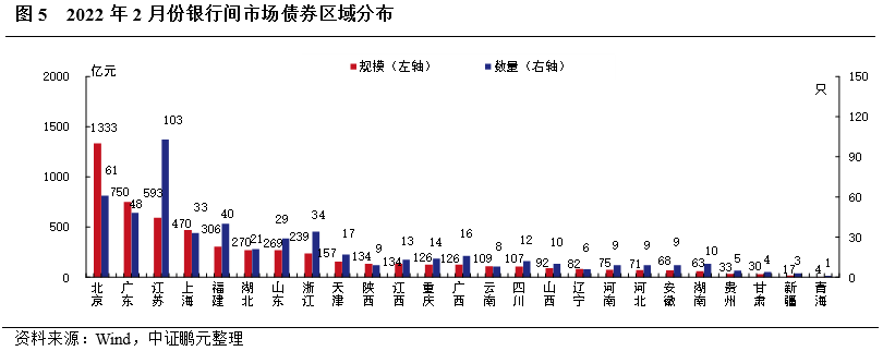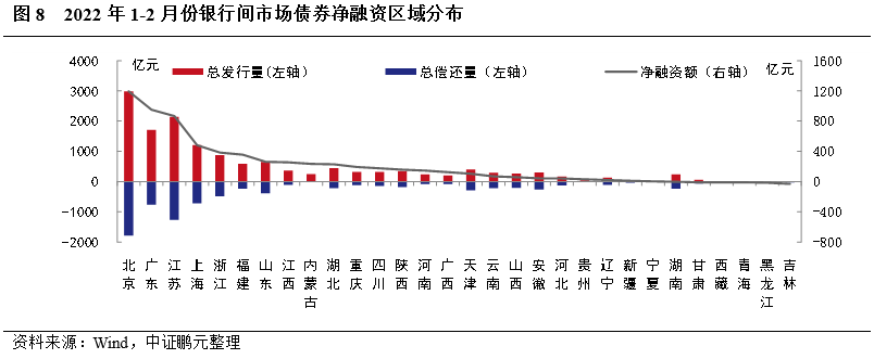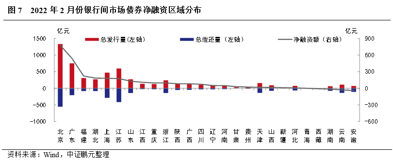 區域分布方面,2月銀行間市場債券發行人主要分布在北京及東部沿海地區,21個省份呈凈融資,5個省份呈凈償還,以北京、廣東凈融資規模最大,以安徽、云南凈償還規模最大。