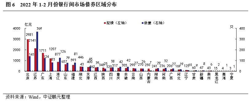 2022年2月份,銀行間市場發行債券廣泛分布于25個省(直轄市、自治區)。從發行規模來看,北京以1,333.40億元的發行規模遙遙領先,廣東、江蘇、上海和福建位列第二梯隊,發行規模在300-800億元之間。從發行數量來看,江蘇排名第一、北京排名前二,廣東、福建、浙江、上海發行數量緊隨其后,在30-50只元之間。綜合2022年1-2月的情況來看,銀行間市場債券的發行主導區域仍集中在北京、江蘇和廣東等地區。從發行規模來看,北京以2,980.60億元的發行規模領先于其他省市,江蘇、廣東和上海緊隨其后。從發行數量來看,江蘇發行369只,位居第一;北京發行141只,位居第二;浙江發行126只,位列第三。