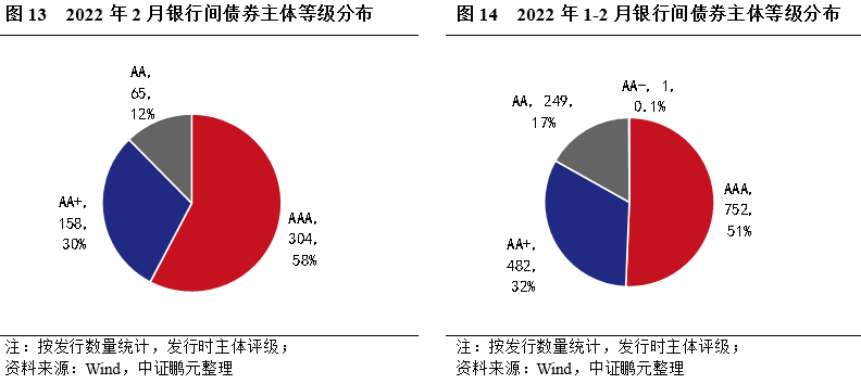 2022年2月銀行間債券發行主體等級集中于 AA+級(含)以上等較高信用級別。具體看,AAA 級發行304只,占比58%,較上月上升11個百分點;AA+級發行158只,占比30%,較上月降低4個百分點;AA 級發行65只,占比12%,較上月降低7個百分點。綜合2022年1-2月來看,銀行間債券發行數量主體等級AA+級(含)以上占比為83%,較上月上升2個百分點,其中AAA級別占比超過半,為51%。