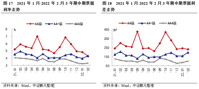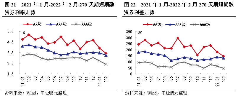 就主要期限品種270天期短期融資券利率和利差走勢來看,2022年2月,AA級、AA+級和AAA級短融平均發行利率分別下行50BP、下行22BP和下行32BP。利差方面AA級、AA+級和AAA級短期融資券平均發行利差分別收窄36BP、收窄9BP、收窄19BP。AA級別利率變動幅度最大,利率下行50BP,AA級別利差變動幅度最大,利差收窄36BP。綜合1-2月利率利差走勢情況來看,短融利率利差下行收窄。