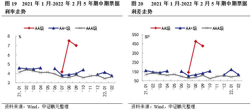 就3年期和5年期中期票據的平均發行利率和平均利差走勢來看,2022年2月,3年期AA級、AA+級和AAA級中期票據平均發行利率較上月分別下行55BP、上行36BP和上行8BP,平均利差分別收窄11BP、擴大39BP和擴大16BP。5年期AA+、AAA級中期票據平均發行利率較上月分別下行36BP、上行19 BP,平均利差分別收窄56BP、擴大13BP。綜合1-2月利率利差走勢情況來看,中期票據利率利差漲跌互現。