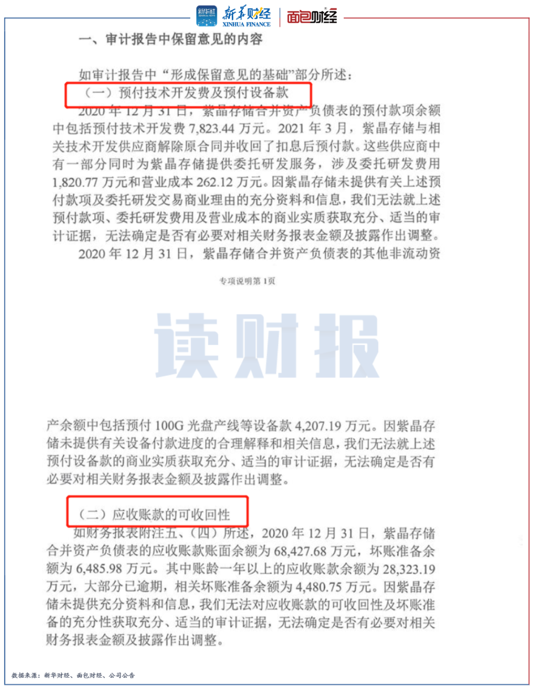 目前,根據(jù)紫晶存儲披露的立案告知書,未具體說明哪些信披涉嫌“違法違規(guī)”。紫晶存儲于2020年2月上市,而立信會計師事務(wù)所對該公司2020年的財務(wù)報表遂出具了保留意見審計報告,主要涉及“預(yù)付技術(shù)開發(fā)費及預(yù)付設(shè)備款”和“應(yīng)收賬款的可收回性”。