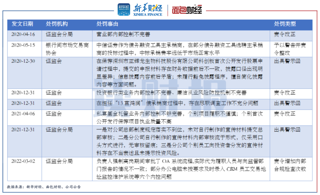 此外,2020年以來,“行業(yè)一哥”中信證券也多次受到來自證監(jiān)會及其分局和銀行間市場交易商協(xié)會的監(jiān)管處罰。