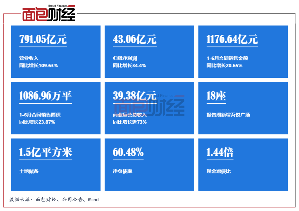 整體業績穩健增長同時,新城控股在商業地產方面的表現尤其突出。在“住宅+商業”雙輪驅動戰略下,新城控股于報告期內累計新增18座吾悅廣場,實現商業運營總收入39.38億元,同比增長近73%。截至2021年6月30日,吾悅廣場開業面積達950.67萬平方米,同比增長62.06%。截至2021年8月25日,新城控股開業、在建及擬建吾悅廣場總數量已達到177座,進駐全國131個城市。