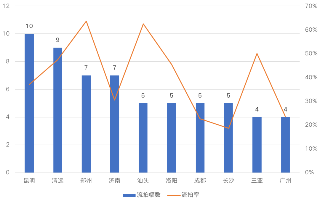 具體來看,10月份流拍地塊主要集中在中西部省會城市和一些非熱點中小城市,如昆明、清遠、鄭州和濟南等,這些城市在本月的土地流拍幅數均超過了5幅,流拍現象相對較為嚴重。
