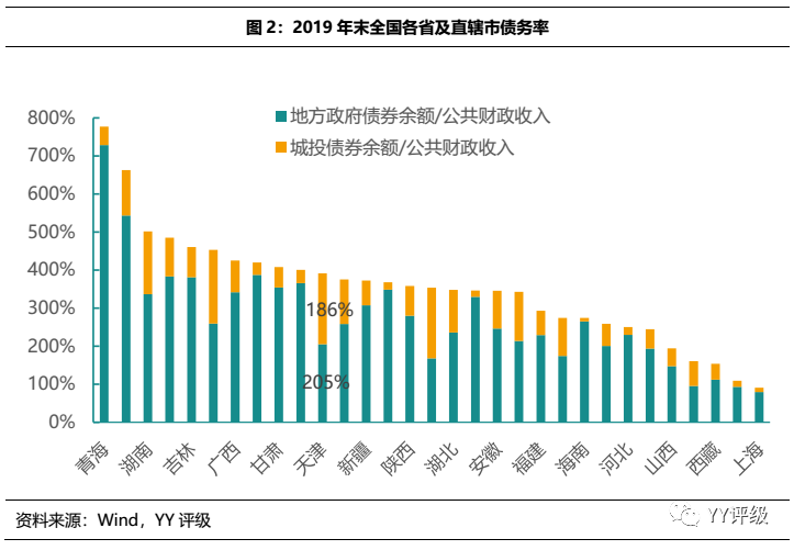 基建開發如火如荼帶來債務規模的擴張,2019年末天津市地方政府債券余額為9,433億元,此為顯性債務;區域內城投債券余額為4,486億元,此為隱性債務的一部分。此前,YY團隊曾分別采用負債端和資產端資金來源兩種方法對省級單位的隱性債務進行了測算,負債端測算得到天津2018年末隱性債務余額為1.878萬億元,資產端測算得到1.702萬億元。以債務率指標對全國31個省級單位進行橫向對比,天津的區域債務總額/公共財政收入比率為391%,相對債務壓力排名靠前。