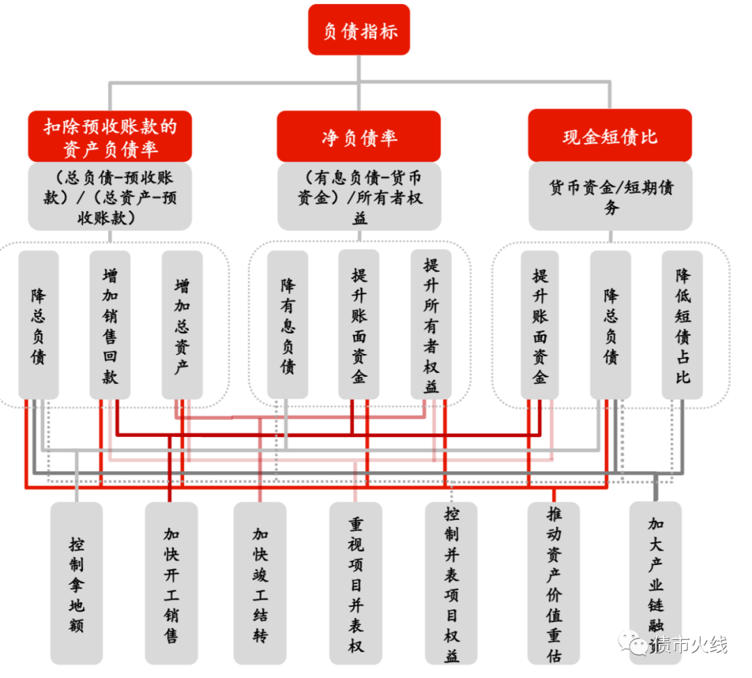控制拿地額、加快開工銷售和加快竣工結轉三種手段主要從地產開發業務層面出發,而重視項目并表權、控制并表項目權益、推動資產價值重估以及加大產業鏈融資則可以從地產金融(包括資產證券化)角度出發找到突破路徑。