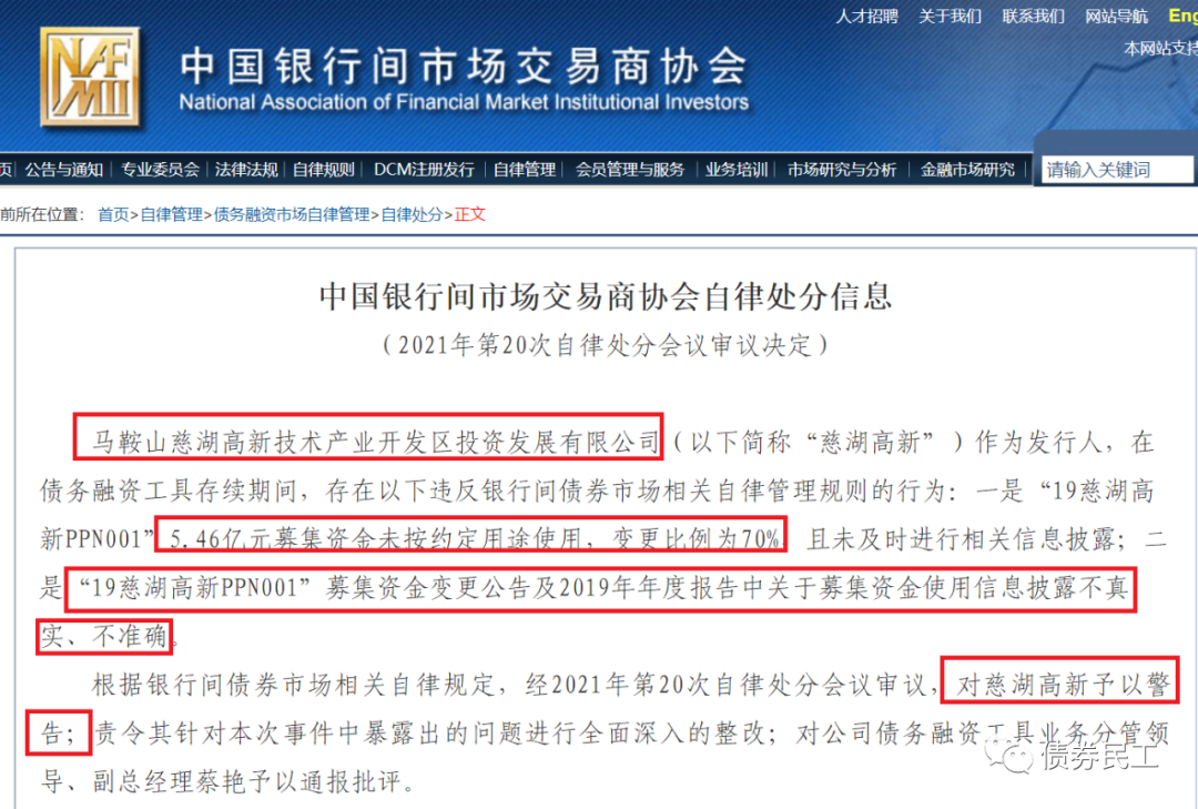 根據中國銀行間市場交易商協會2021年12月16日的公告信息,馬鞍山慈湖高新技術產業開發區投資發展有限公司因為“19慈湖高新PPN001”未按照約定使用募集資金、募集資金變更公告信息不真實不準確等原因,交易商協會對發行人予以警告。
