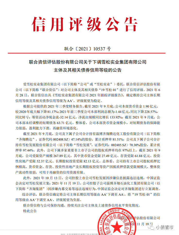 11月23日,聯合資信公告稱將雪松實業集團有限公司(以下簡稱“雪松集團”)主體和“19雪松01”信用等級由AA+下調至AA-,評級展望為負面。