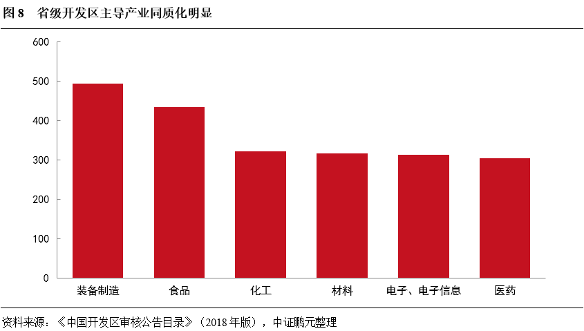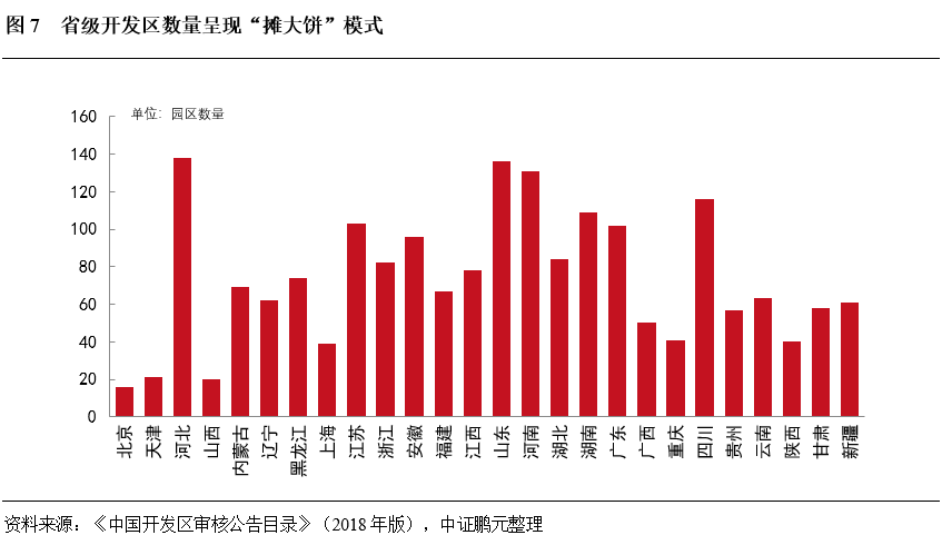 大量產業園區重數輕質,同質化嚴重,部分園區要素低效利用。地方致力于新建各類園區,表現出明顯的“重數量,輕質量”特征,同質化傾向日趨嚴峻,造成了園區之間的競爭日趨激烈,園區招商日益困難,從而推升了省級開發園區的空置率。