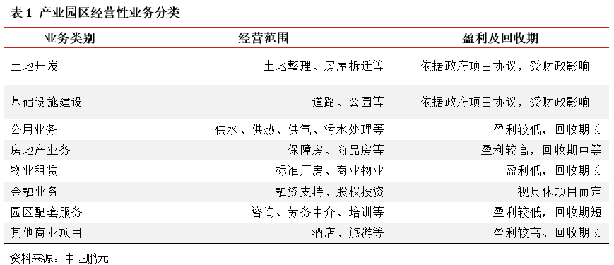不同的園區經營性業務在盈利和投資回報周期上差別較大。我們通過對國家級開發區的典型園區平臺的主營業務進行梳理后,將產業園區業務劃分為8大類。其中土地開發、基礎設施建設、公用事業、保障房等業務與傳統城投業務區別不大,主要差異在于項目業主方,部分園區存在對應的管理部門或擁有獨立核算的財政體系,主要業主為園區管理部門。而隨著工業化的發展,市場競爭愈發激烈,企業對于地方招商引資優惠政策要求越來越高,不僅需要土地,還需要提供廠房、研發基地、勞務、金融支持等服務,產業園區開發業務相應衍生開來,但此類業務盈利水平普遍偏低,且回收期較長,資金占用較為明顯。相較于國家級開發區內的入駐企業質量和數量,省級開發區內的企業發展相對水平有限,故多數區縣城投公司從事的園區自營開發業務主要集中在物業租賃和金融服務方面,其他方面的經營性業務并未過多參與。