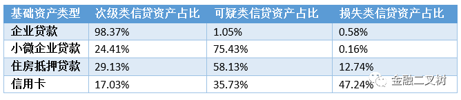 不良ABS根據基礎資產不同可以分為信用卡類、企業(yè)貸款類、小微企業(yè)貸款類、住房抵押貸款類、個人汽車貸款類、一般消費貸款類和混合貸款類。在這幾種資產中信用卡類是被認為分散度最高的,這是由于信用卡類客戶以及貸款性質決定的,這類ABS入池貸款筆數相較其他類ABS是最多的,每筆規(guī)模也普遍較小,以下表為例: