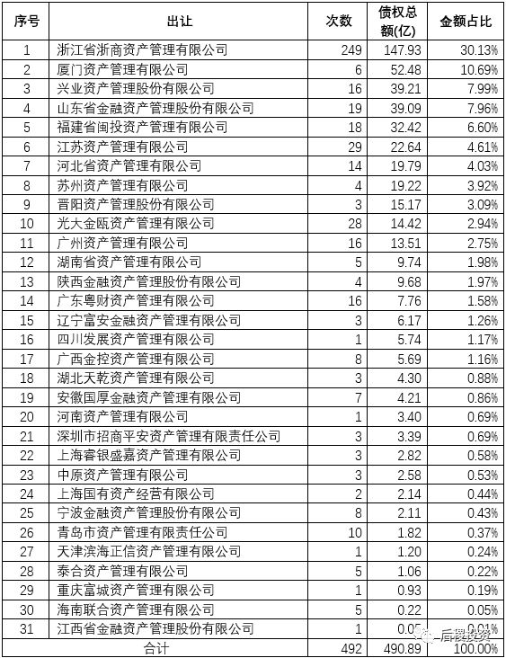 共31家地方AMC在2018年有出讓債權(quán)記錄,排名前10的地方AMC總計比重達(dá)82%,市場集中度較高。由于地方AMC受讓債權(quán)后,處置方式多樣,通過再次公開轉(zhuǎn)讓的形式只是其中之一,導(dǎo)致整體出讓金額只有490.89億,占受讓金額的33%。