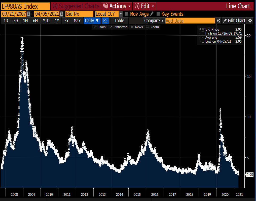 需求端,疫情以來美聯儲持續進行量化寬松,以每個月1200億美元的節奏購買美國國債及房貸支持證券,對美元債券市場釋放了天量的流動性。在美國經濟重啟、通脹大幅抬升的背景下,美聯儲至今沒有釋放縮減購債的信號。這也進一步抬升了投資者的風險偏好,使得美國垃圾債到期收益率低于4%、信用利差低于300bps的歷史最低位,也形成了市場對大量低評級甚至無評級的中資地產美元債的強勁需求。