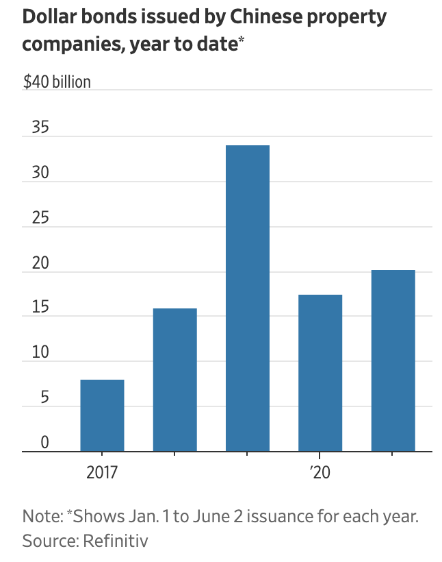 據Refinitiv數據顯示,2021年前五個月中國房地產公司已經發行203億美元的債券,較去年同期增長16%,在過去五年同期比較中僅次于2019年。高收益債券的投資者競爭認購中資地產美元債,仿佛對正在發生的商票逾期、個體違約、樓市調控趨嚴都視若罔聞。