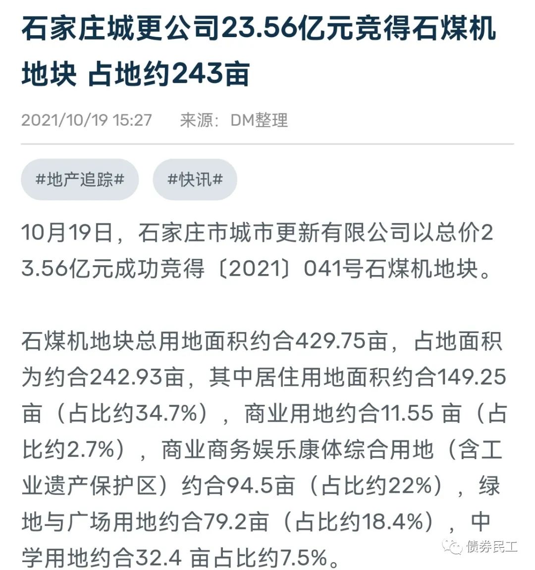 2021年10月19日,石家莊國控投資集團有限責任公司的孫公司石家莊城市更新有限公司以23.56億元的價格摘得石家莊市總出讓面積為242.93畝的土地,包含居住用地、商業用地等。