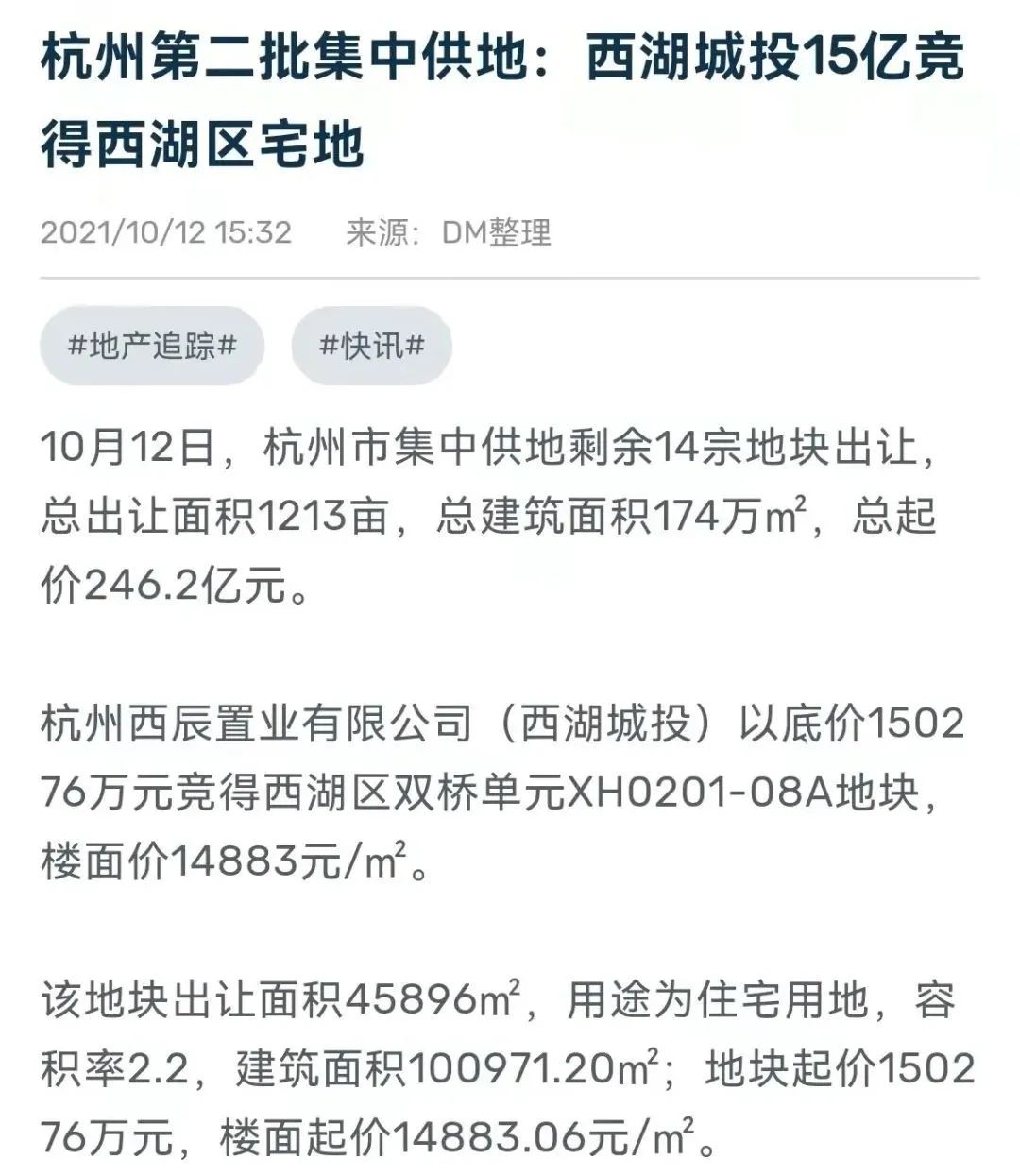 2021年10月12日,西湖城投的子公司杭州西辰置業有限公司以150276萬元的價格摘得杭州市西湖區總出讓面積為45896平方米的商住地。