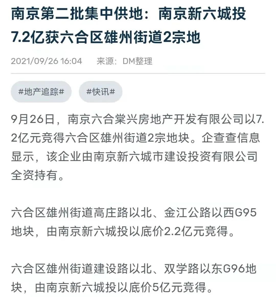 2021年9月26日,南京新六城市建設投資有限公司的子公司以7.2億元的價格摘得南京市六合區雄州街道的2宗土地。