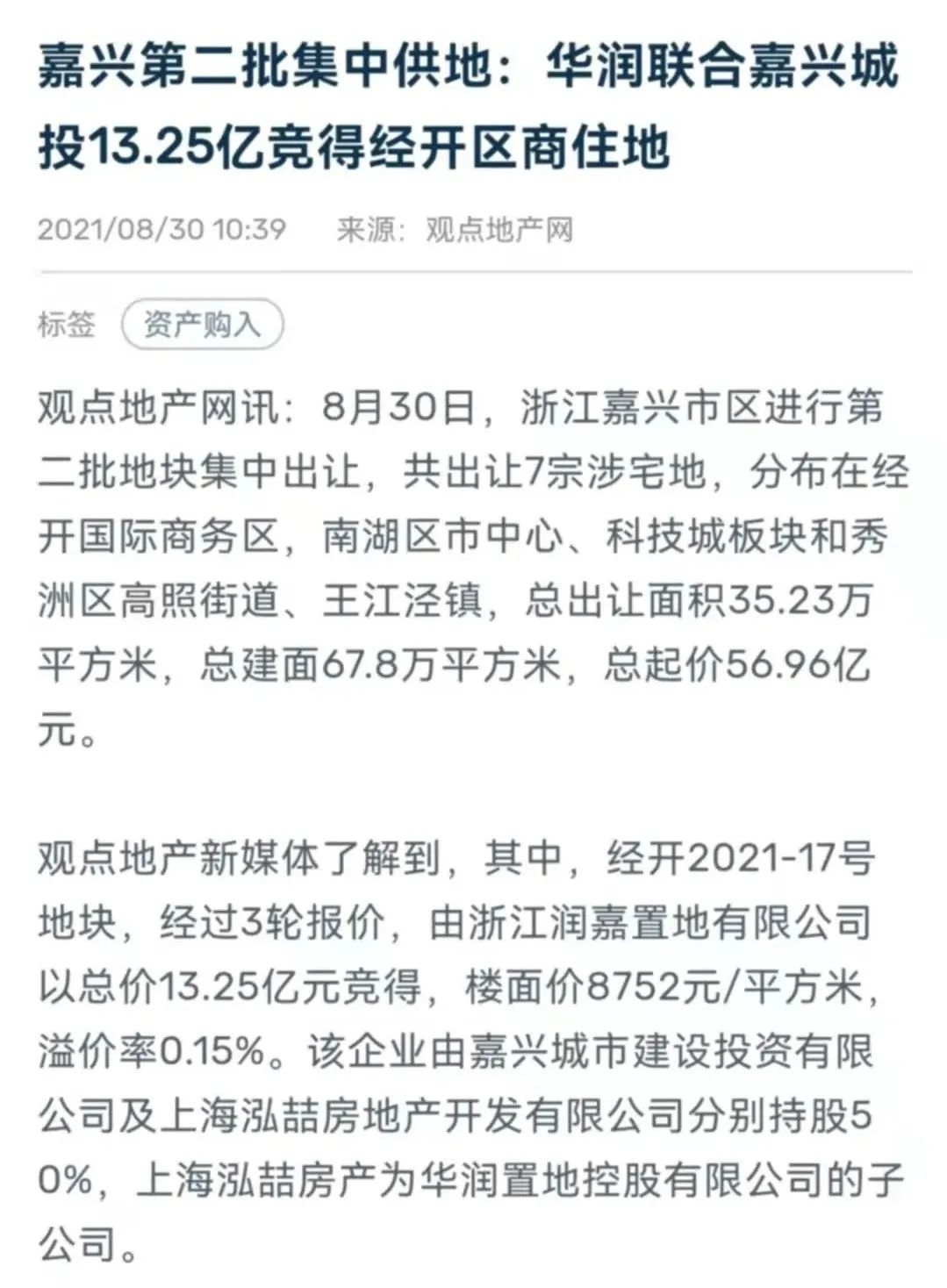 2021年8月30日,嘉興城市建設投資有限公司的子公司聯合華潤置地,以13.25億元的價格摘得嘉興市區總出讓面積為35.23萬平方米的商住地。