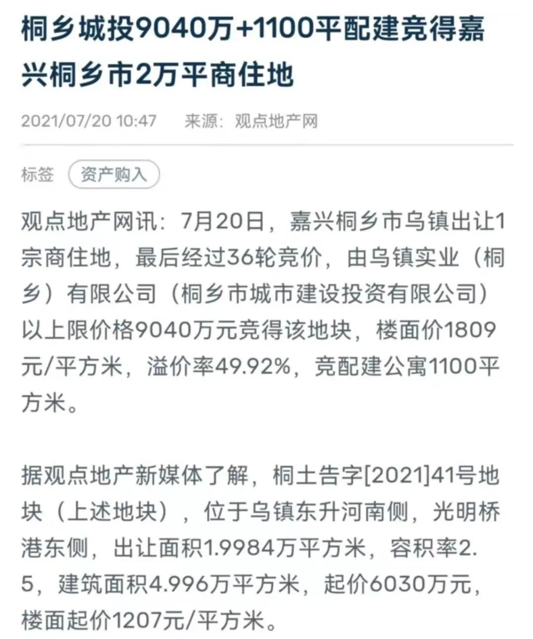 2021年7月20日,桐鄉市城市建設投資有限公司以9040萬元的價格摘得嘉興桐鄉市烏鎮總出讓面積為1.9984萬平方米的商住地。