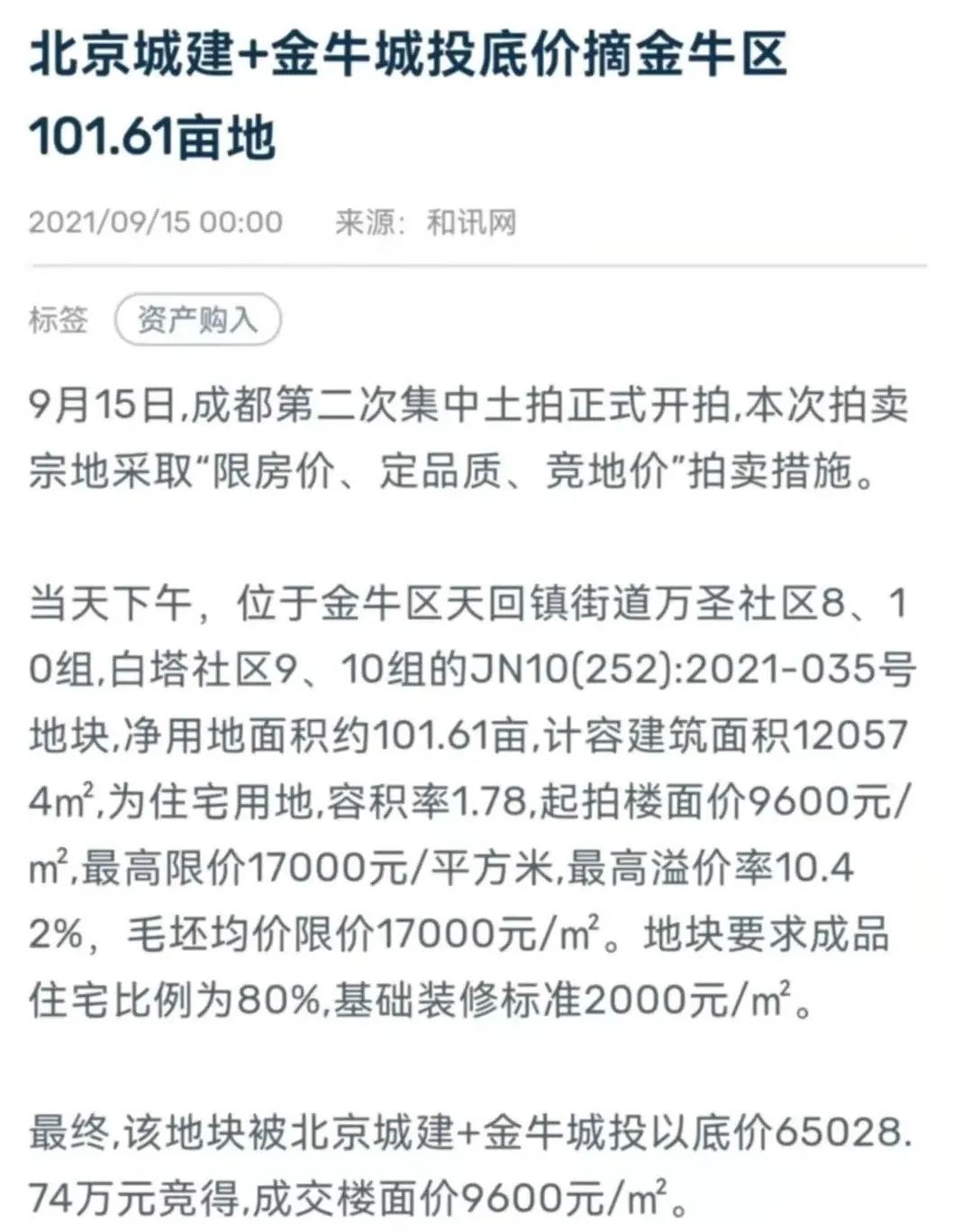 2021年9月15日,北京城建和金牛城投合作以65028.74萬元的價格摘得成都市金牛區凈用地面積為101.61畝的住宅用地。