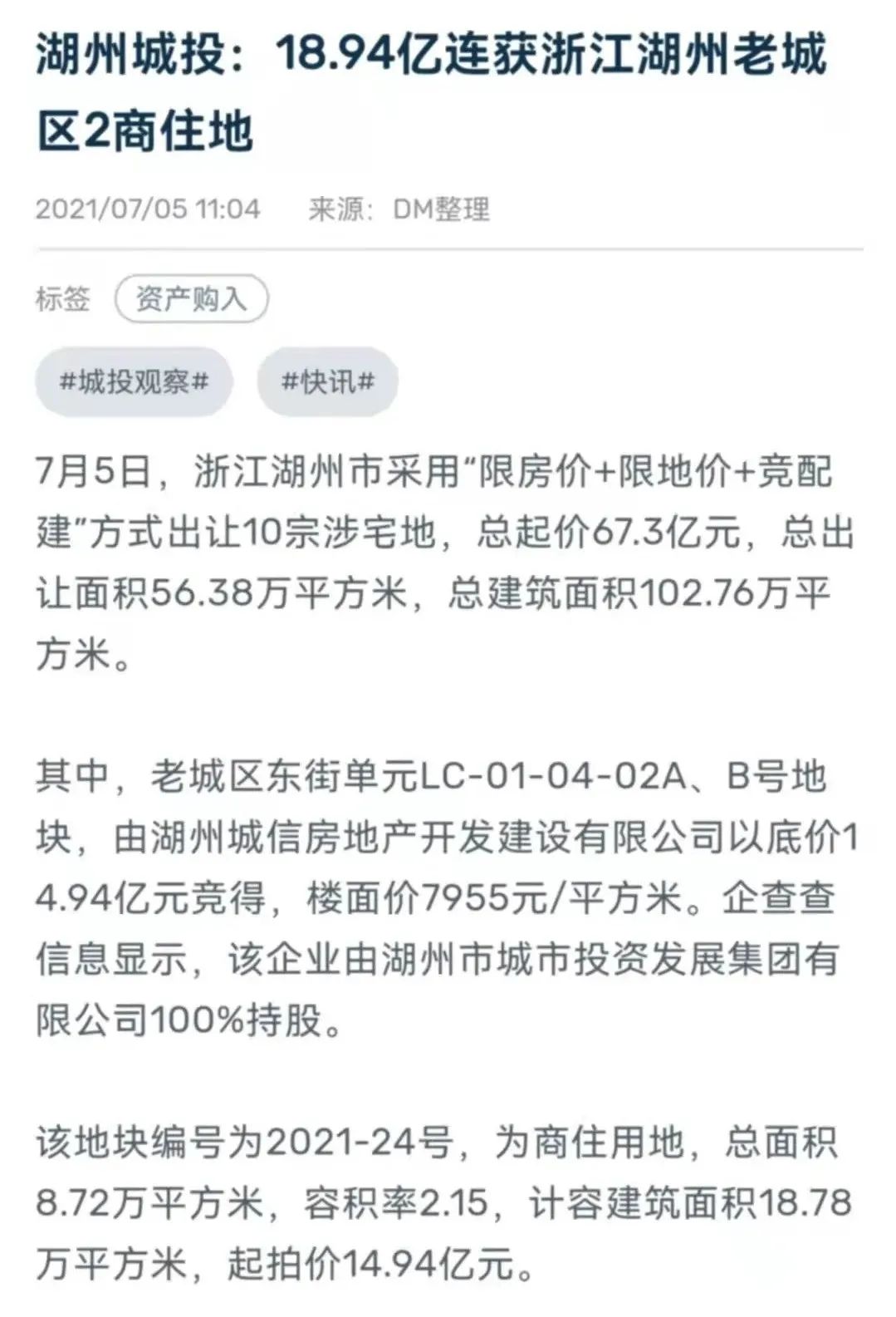 2021年7月5日,湖州市城市投資發展集團有限公司的子公司以18.94億元的價格摘得浙江湖州市總出讓面積為8.72萬平方米的商住地。