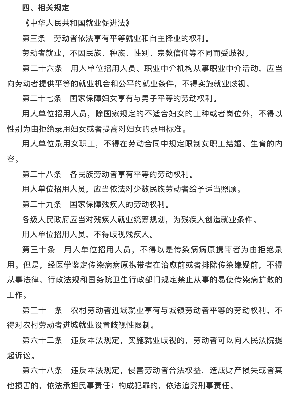 好家伙,短短65個字,涉及到的就業(yè)歧視內容就包括:年齡歧視、身高歧視、民族歧視、性別歧視、地域歧視、戶籍歧視、宗教信仰歧視、疾病歧視,都是國際勞工公約《禁止就業(yè)歧視公約》和《中華人民共和國就業(yè)促進法》所明令禁止的行為。
