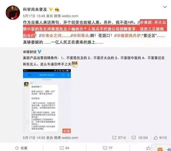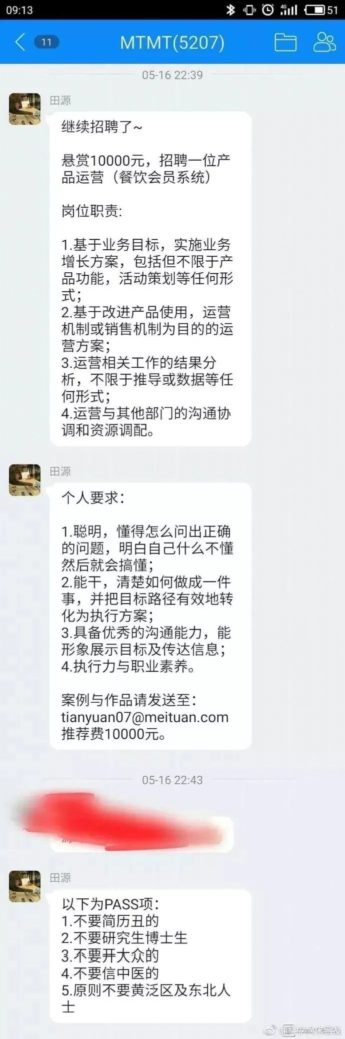 2017年5月,美團內部的一則招聘截圖流出,截圖顯示,一位名叫田某的小領導要招一個運營,提出了他的5個不要:不要簡歷丑的;不要研究生博士生;不要開大眾的;不要信中醫(yī)的;原則上不要黃泛區(qū)和東北人。消息雖然是發(fā)在公司內網,但截圖很快流出,引起口誅筆伐,為美團帶來海量的負面報道。