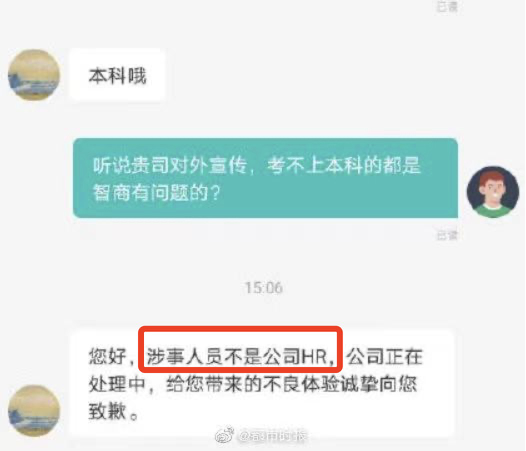 今年4月,杭州某企業(yè)招聘人員在招聘網站應聘者溝通時,表示“考不上本科的都是智商有問題的”,由此掀起網友口誅筆伐的熱議,該公司也因此“出名”。