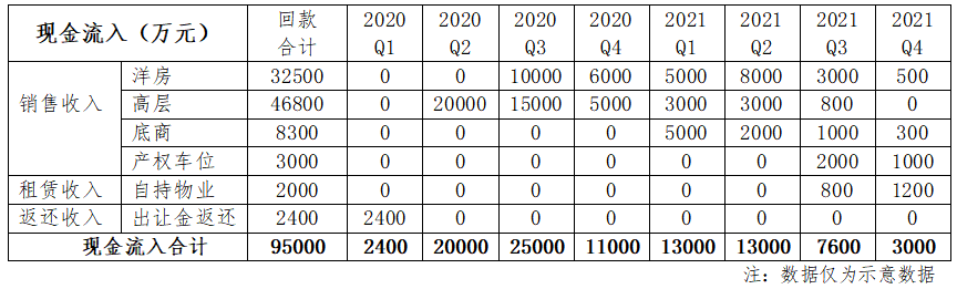就項(xiàng)目本身來說,現(xiàn)金流入體現(xiàn)的是每一時刻下的流入項(xiàng)合計,即銷售回款流入、經(jīng)營租賃流入和政策返還類流入合計;聯(lián)動的各項(xiàng)基礎(chǔ)數(shù)據(jù)包括業(yè)態(tài)指標(biāo)、銷售單價與去化、回款等。