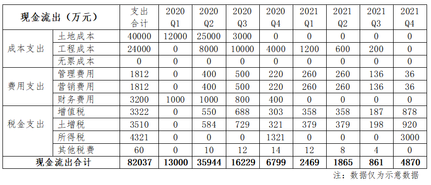 為保證項(xiàng)目正常獲取、開工建設(shè)及開盤銷售,需在不同交易進(jìn)度、銷售進(jìn)度和工程形象進(jìn)度下支付不同比例的成本費(fèi)用稅金,合計每一時刻下的支出合計形成相應(yīng)的現(xiàn)金流出。