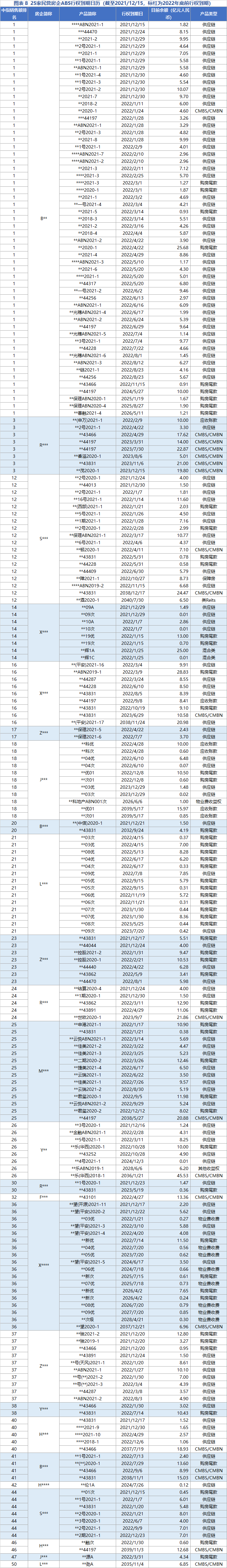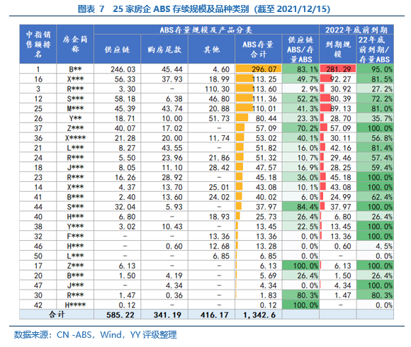 銷售端下行,再融資未接,到期壓力如影隨形,年關(guān)下的民營房企仍在暗夜中穿行。近期YY評級地產(chǎn)組盤點了14家民營房企短期兌付壓力。本篇,我們將視角聚焦于ABS這一融資品種,并將統(tǒng)計范圍擴大至銷售額前50中YY評級在5及以下的25家民營房企,整理其存量、類別及行權(quán)到期情況。
