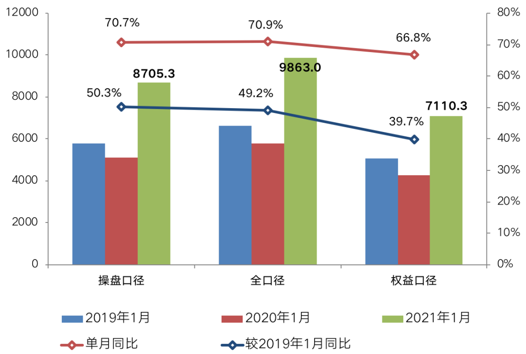 具體來看,2021年1月,TOP100房企單月實現銷售操盤金額8705.3億元,高于2019年及2020年同期,部分城市受去年年底成交翹尾行情影響,熱度不減,延續至1月,對年初成交起到較大帶動作用。