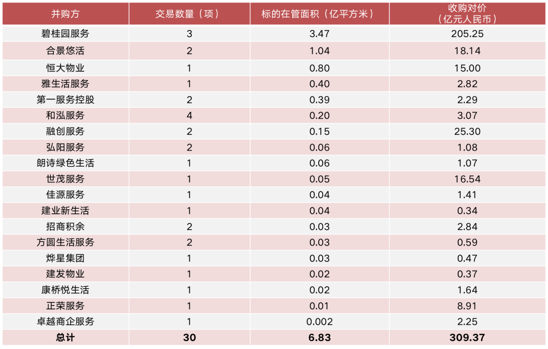 當(dāng)前,行業(yè)的市場(chǎng)格局仍較為分散且競(jìng)爭(zhēng)較大,擴(kuò)規(guī)模、提高市場(chǎng)占有率,仍是物企重要的訴求之一。其中,收并購(gòu)是企業(yè)快速提高管理規(guī)模的重要方式。