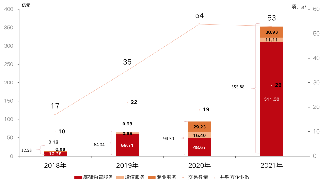2021年,物業(yè)行業(yè)并購(gòu)市場(chǎng)火熱,據(jù)克而瑞物管和中物研協(xié)數(shù)據(jù),截至2021年12月31日,共有29家上市物企發(fā)起53項(xiàng)并購(gòu),并購(gòu)交易總額達(dá)355.88億元。