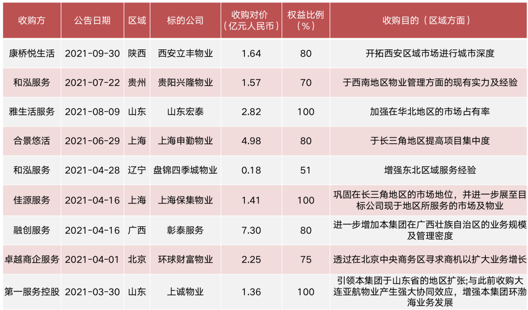 圖:2021年以來(lái)上市物企補(bǔ)強(qiáng)區(qū)域布局方面的收并購(gòu)事項(xiàng)一覽