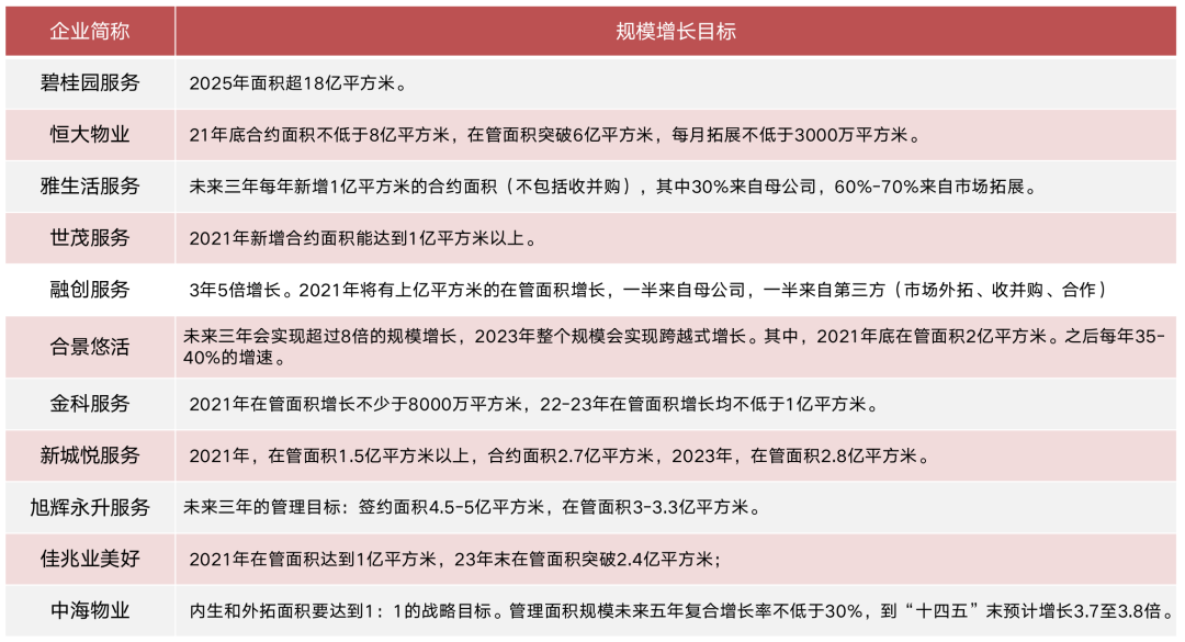 從企業(yè)端來(lái)看,迫切擴(kuò)規(guī)模的需求,驅(qū)動(dòng)企業(yè)發(fā)起并購(gòu)。在年初,多家物企即披露了未來(lái)三至五年規(guī)模擴(kuò)張目標(biāo),為全年的規(guī)模擴(kuò)張?zhí)岢鲋敢H纾暇坝苹钤诠芤?guī)模3年8倍;世茂服務(wù)提出規(guī)模3年5倍;恒大物業(yè)2021年在管面積將破6億平方米,合約面積不低于8億平方米;碧桂園服務(wù)則表示2025年規(guī)模超18億平方米等。