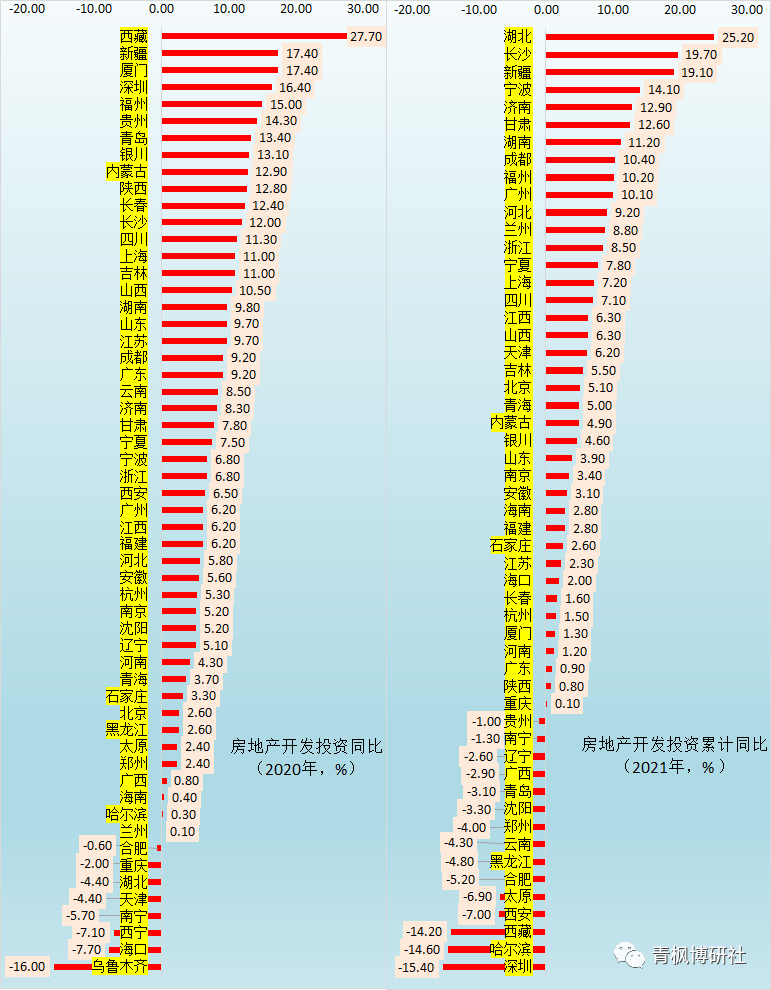 (一)從房地產(chǎn)開發(fā)投資同比來看,西藏、西安、太原、合肥、黑龍龍江、云南、鄭州、沈陽、青島等地下滑同樣比較大。2021年前三季度,鄭州地產(chǎn)開發(fā)投資同比下降4%,但如果從全年數(shù)據(jù)來看,則可能更糟心,這大概也是鄭州大幅放松地產(chǎn)調(diào)控的原因。