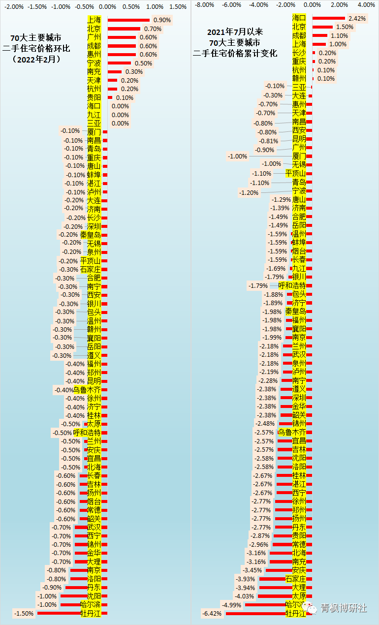 (二)從房價(jià)變化來看,2022年2月當(dāng)月,70大城市中有57個(gè)城市的二手住宅價(jià)格環(huán)比出現(xiàn)了下降,23個(gè)城市下降幅度超過0.50%,沈陽、哈爾濱、牡丹江等三個(gè)東北城市的下降幅度均超過1%。當(dāng)然,若從2021年7月以來的6個(gè)月累計(jì)下降幅度來看,70個(gè)大中城市中的62個(gè)城市二手住宅價(jià)格出現(xiàn)了下降,牡丹江、哈爾濱、太原、大理、石家莊、安慶、南充、北海等城市的二手住宅價(jià)格累計(jì)下降幅度均超過3%,其中哈爾濱與牡丹江分別下降6.42%和4.99%。