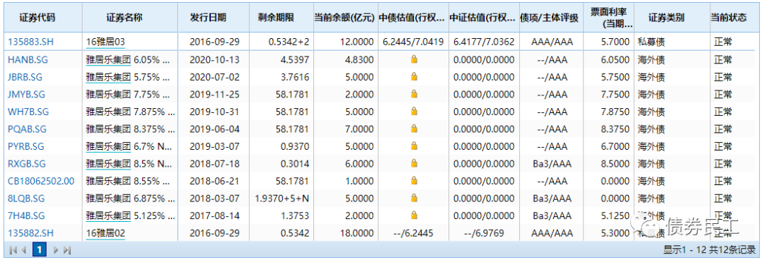 雅居樂集團為香港上市公司(股票代碼3383.HK),實際控制人為陳卓賢為代表的陳氏家族,國內主體信用評級為AAA。目前在國內存續兩只私募債券,總規模30億元;其余債券均為境外債券。