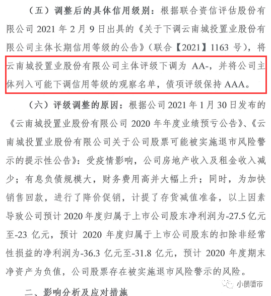 評級調整原因為,云南城投預計2020年度歸屬于上市公司股東扣非損益的凈利潤為-36.3億元至-31.8億元,預計2020年度期末凈資產為負值,其股票存在被實施退市風險警示的風險。