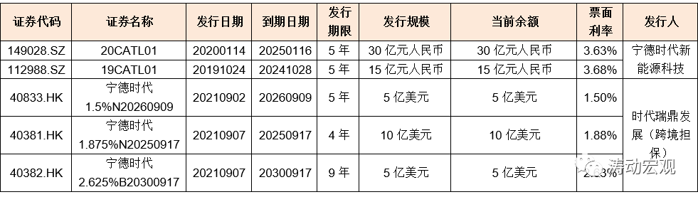 (2)截至2021年9月底,寧德時代共有5只存量債券,債券余額為175.28億元(凈增31.46億元)。具體看,這5只債券主要包括兩只境內(nèi)債(合計45億元人民幣)和3只美元債(合計20億美元),其中美元債主要由寧德時代借助在香港的全資子公司時代瑞鼎發(fā)展以跨境擔保的形式發(fā)行。